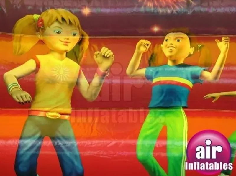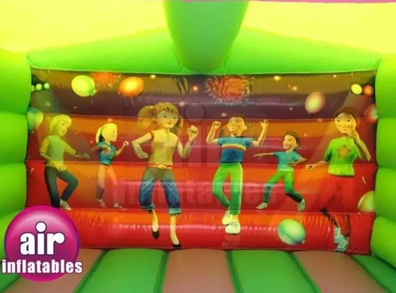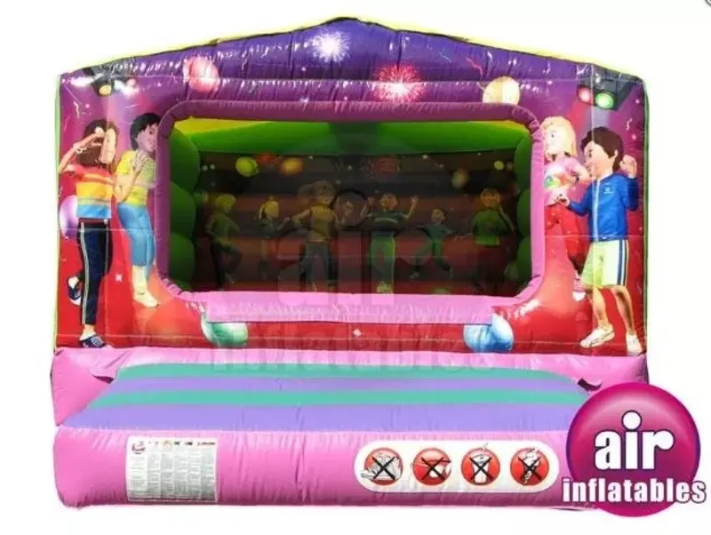 Fully featured Inflatable Ball Pool with sewn in shower cover, deep bounce bed, superb digitally printed artwork in a colourful Disco Party theme and a fully webbed bed and step.